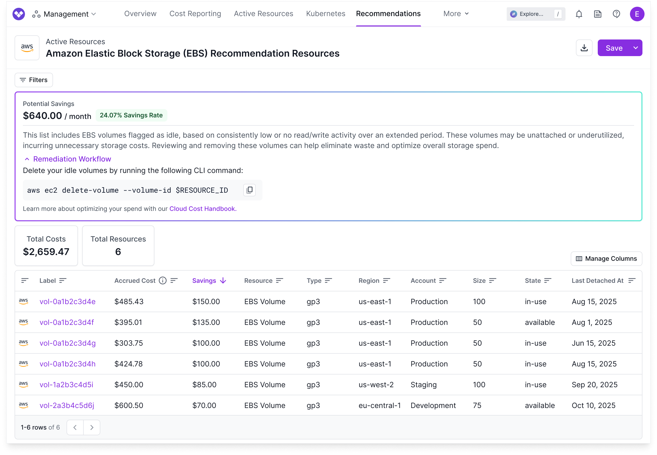 Now, when viewing a Cost Recommendation you will see detailed context and clear, actionable steps to remediate the issue, such as CLI commands or instructions specific to the provider’s console.