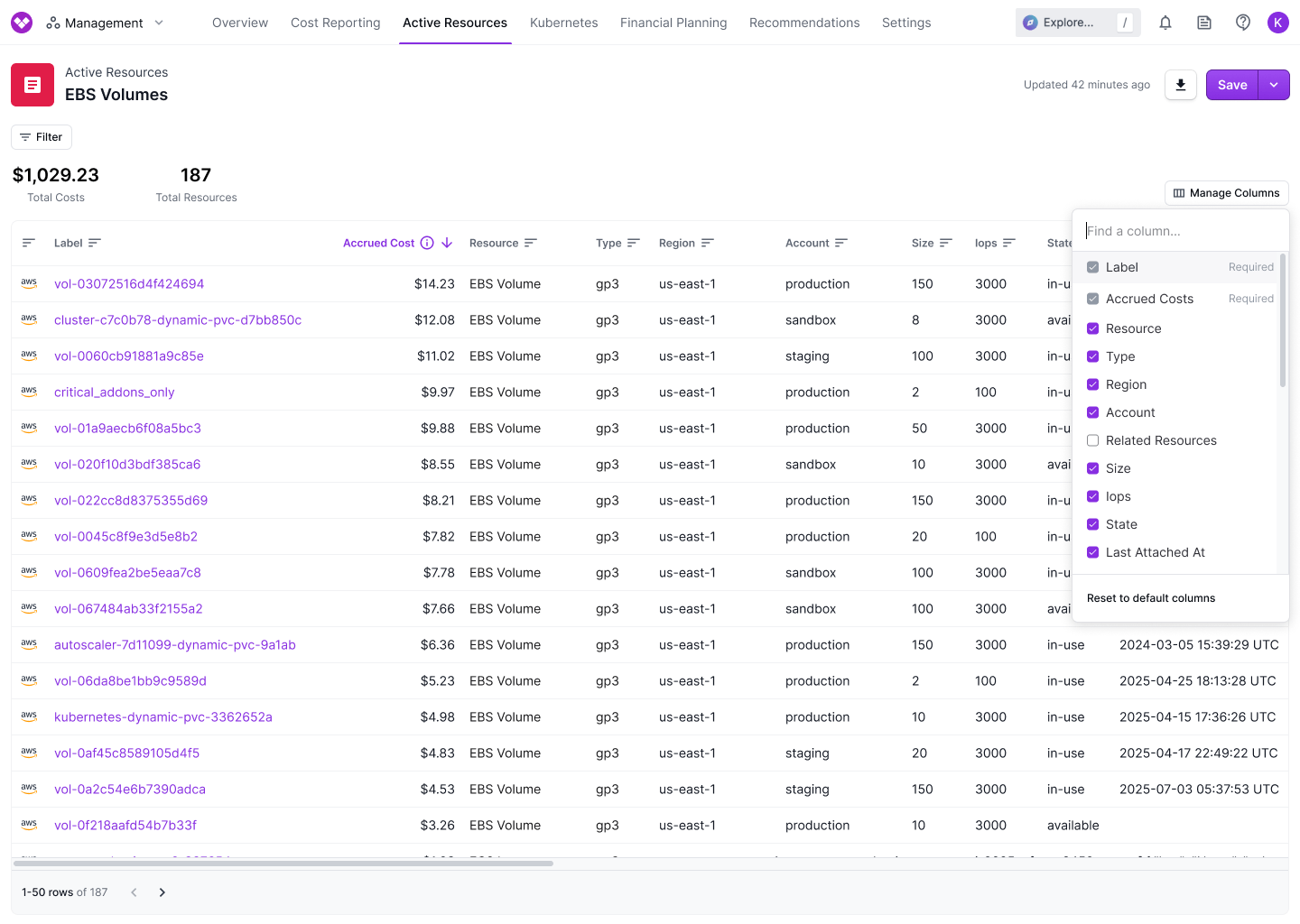 With Custom Columns for Resource Reports, customers can now configure Resource Reports to display any available metadata collected by Vantage, and arrange the columns in any order. When viewing a Resource Report, users can use the “Manage Columns” drop down to select the columns they wish to include in the report, and are able to drag and drop the columns into the order they like. This state is persisted for saved reports, ensuring the most critical information is surfaced for all Vantage users. For example, you can now bring more information to an Unattached EBS volumes report by adding the columns of Attachment State, Provisioned IOPS, Memory, and Last Attached Date to determine which volumes should be addressed for deletion first.