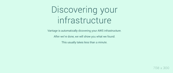 Upon creating this Cross Account IAM Role, you can return to Vantage from creating the IAM Role and you'll notice that Vantage has begun a sync of everything in your AWS account. It will check every AWS region and every supported AWS service and, when complete, give you a summary of everything it found. This process usually takes less than a minute but is dependent on the number of resources you have in your AWS account. You don't need to refresh the page. When Vantage is done with its discovery it will give you a summary of everything it found like below: