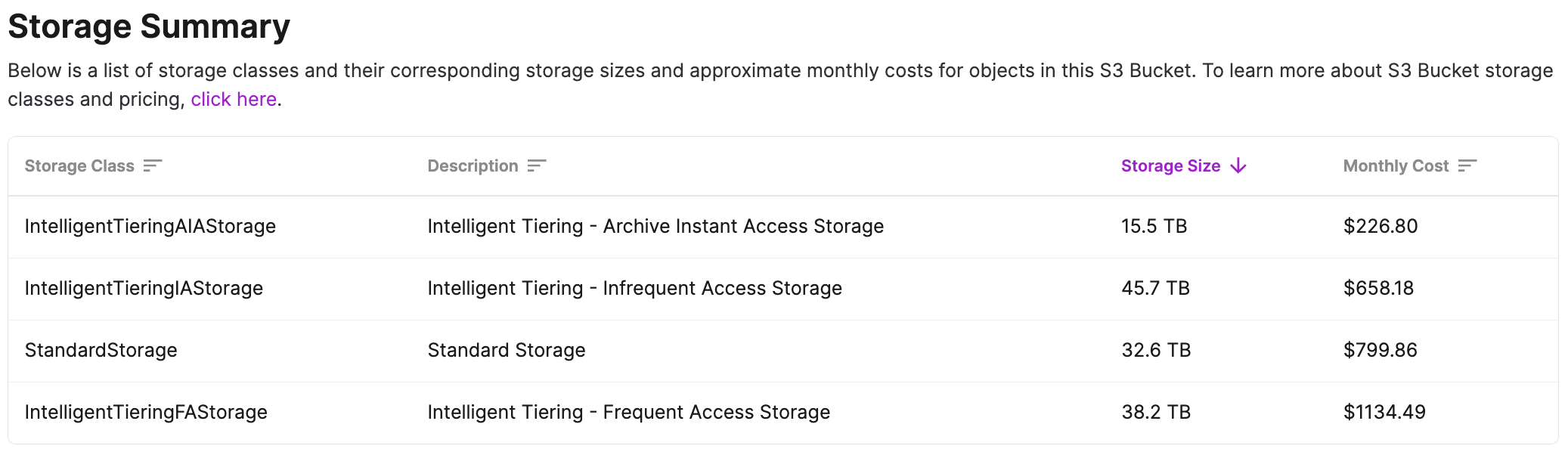 Vantage automatically profiles all S3 Buckets and their underlying storage classes and compute prices accordingly, with no action necessary by you. If you're an existing user, you can check your Vantage Console and see the breakdown of costs accordingly. There are two things Vantage will show: (1) the "Monthly Price" field shown in tables where S3 Buckets are present shows the total cost of that S3 Bucket across S3 Storage Types and (2) on S3 Bucket resource pages you'll see the full breakdown of storage summaries and their accompanying costs. In the latter case, if your S3 Bucket is using multiple storage types, you'll see the corresponding prices and storage for all of them like what is shown below: