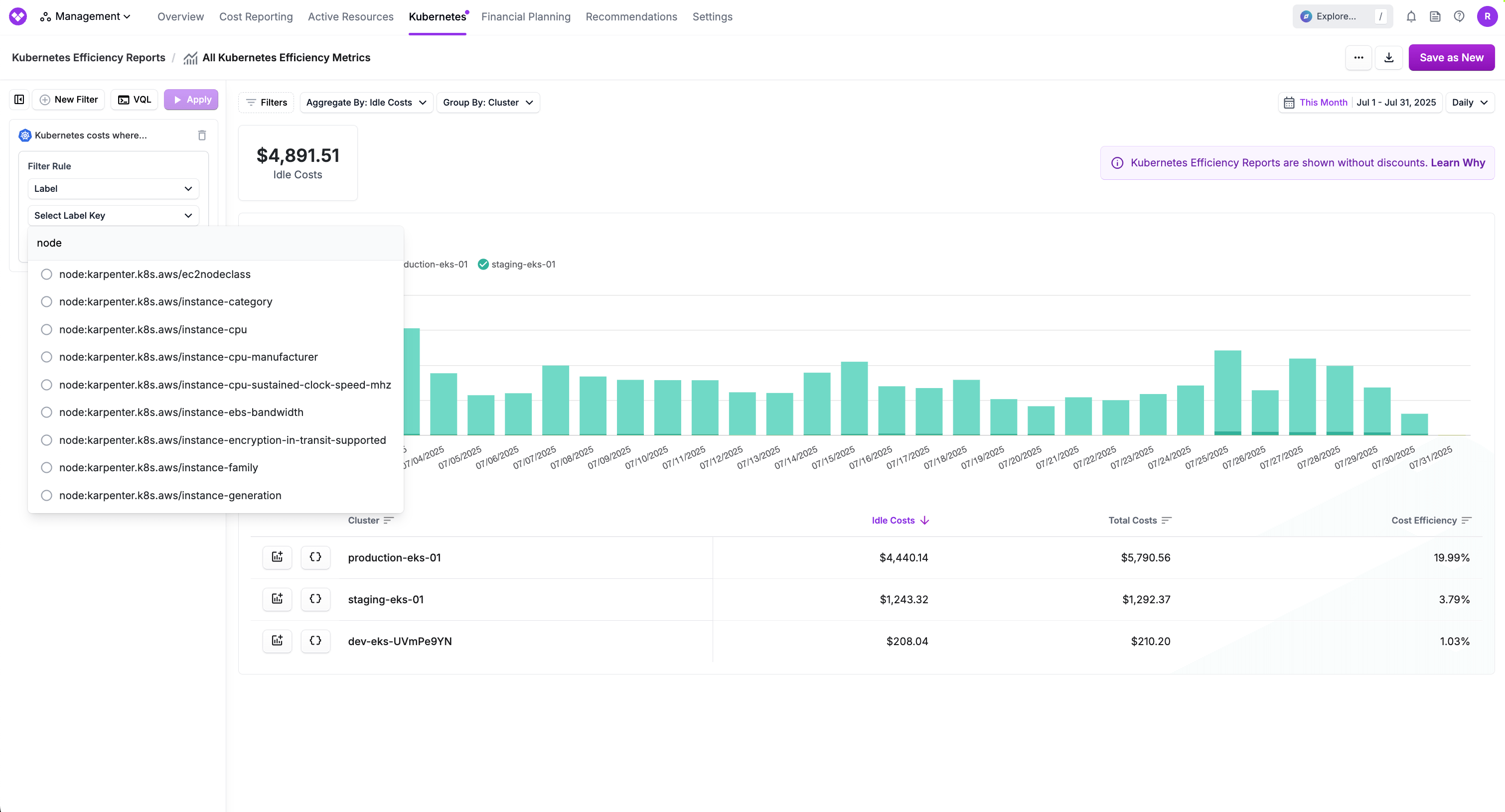 These labels are automatically applied to pods and made available as Tags in filter and group-by dimensions, as pvc:xyz and node:xyz respectively. Both labels are available in Cost Reports, and Virtual Tag configurations, and additionally, Node Labels are made available in Kubernetes Efficiency Reports.
