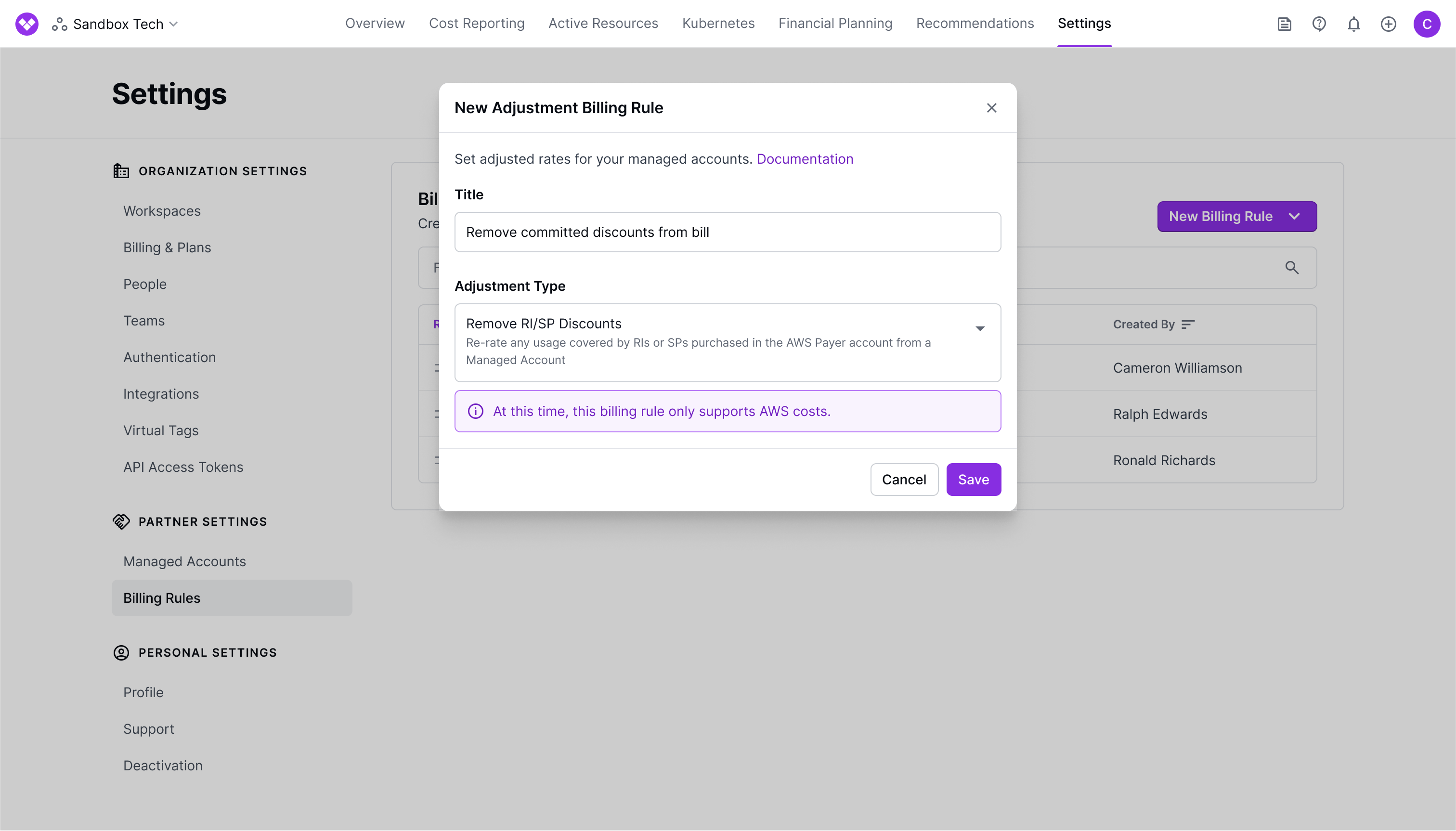 To set up Discount Toggling for MSP Managed Accounts, navigate to the “Billing Rules” section of Partner Settings within the Settings page. Select “New Billing Rule” and then “Adjustment” to initiate creating a new Billing Rule. After giving the rule a name, select “Remove RI/SP Discounts”, and save the Billing Rule.
