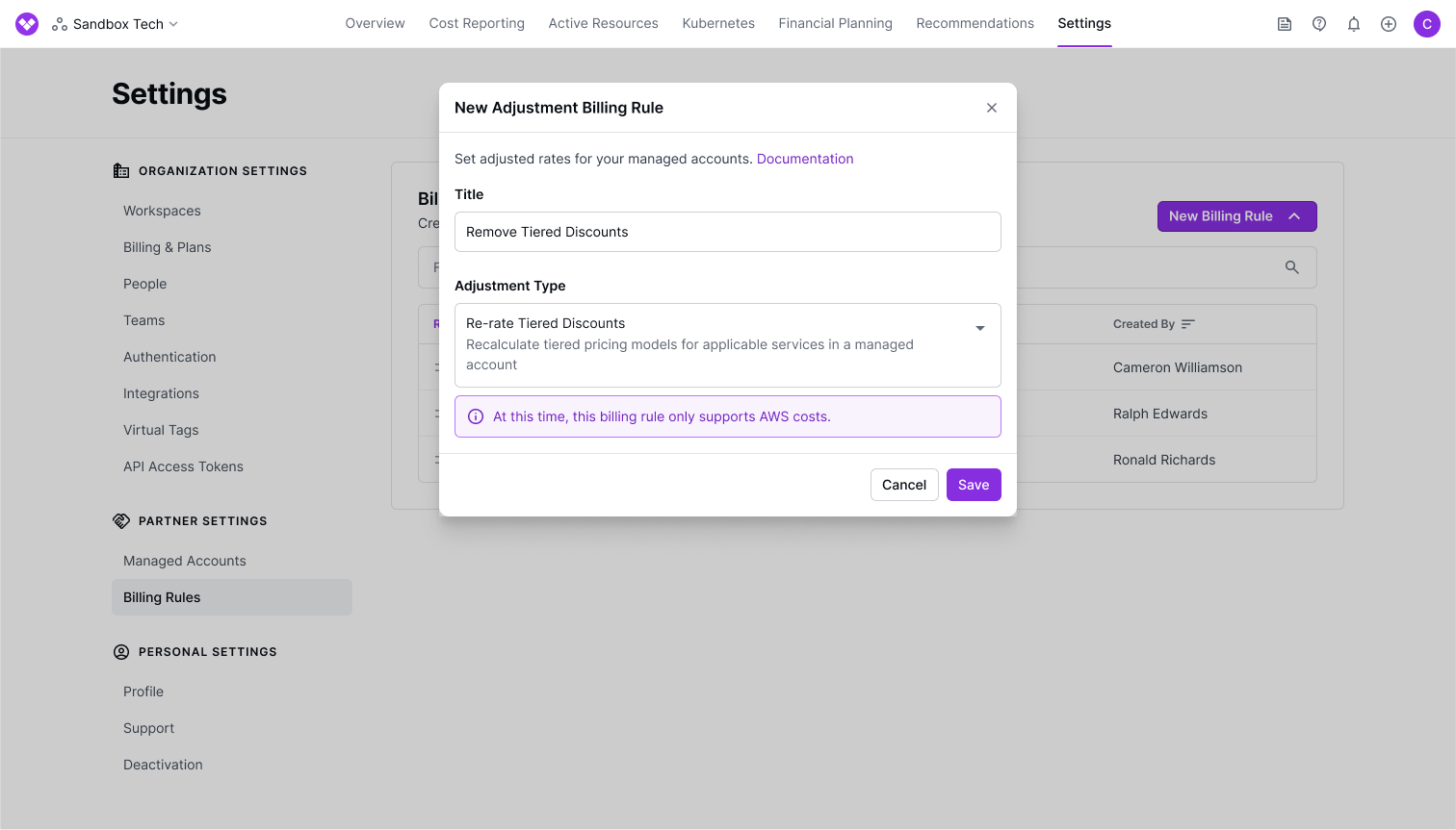 Now, with the launch of Re-Rating Tiered Discounts for MSP Managed Accounts, Vantage for MSP customers can automate the calculation of pricing tiers for each end customer, and have their usage accurately reflect their own tiered pricing in real time. MSPs can create Re-Tiering billing rules, in the Billing Rules section of Settings, and apply the billing rule to customers’ Managed Accounts. Users viewing the parent Management Account will still see the cost that is billed by AWS to enable margin comparisons for end customers.