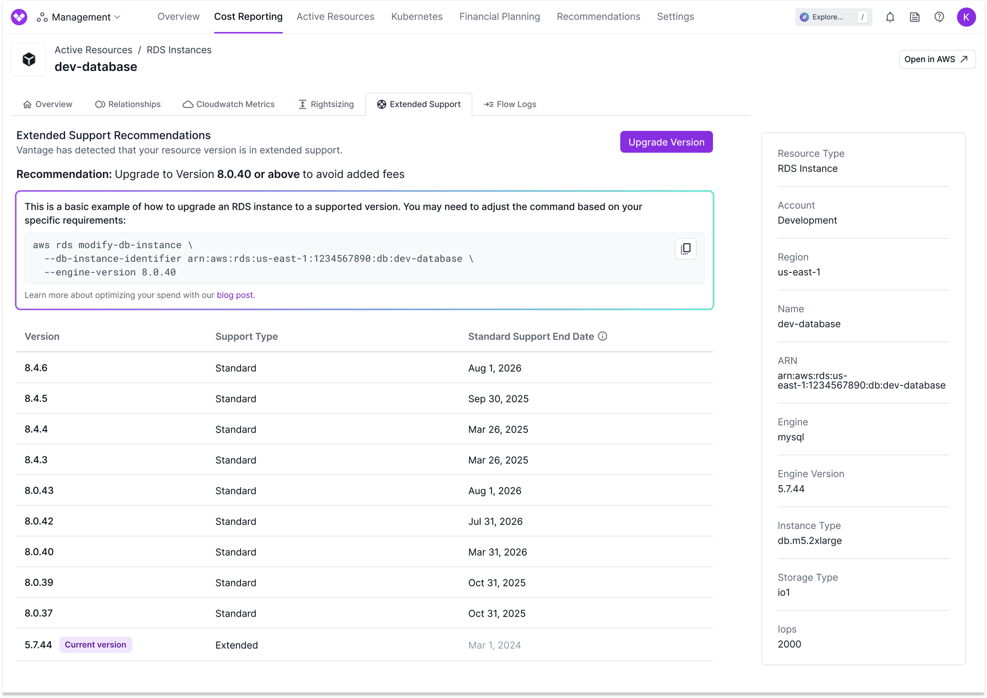 Now, with the launch of AWS Extended Support Reporting and Recommendations for RDS, Vantage automatically surfaces recommendations for RDS instances currently incurring Extended Support fees, as well as those set to enter Extended Support within the next three months with projected cost estimates. Vantage also automatically annotates RDS instances with metadata in Active Resource Reports, indicating their current support type (Standard or Extended) and the support calendar with end dates of each support phase. Customers can use this information to filter and create views of databases based on their support status or End of Support dates, facilitating timely upgrades and cost avoidance. Vantage will guide engineers on which version they need to upgrade to in order to avoid additional charges, as well as provide direct linking to the AWS console to perform the upgrade.