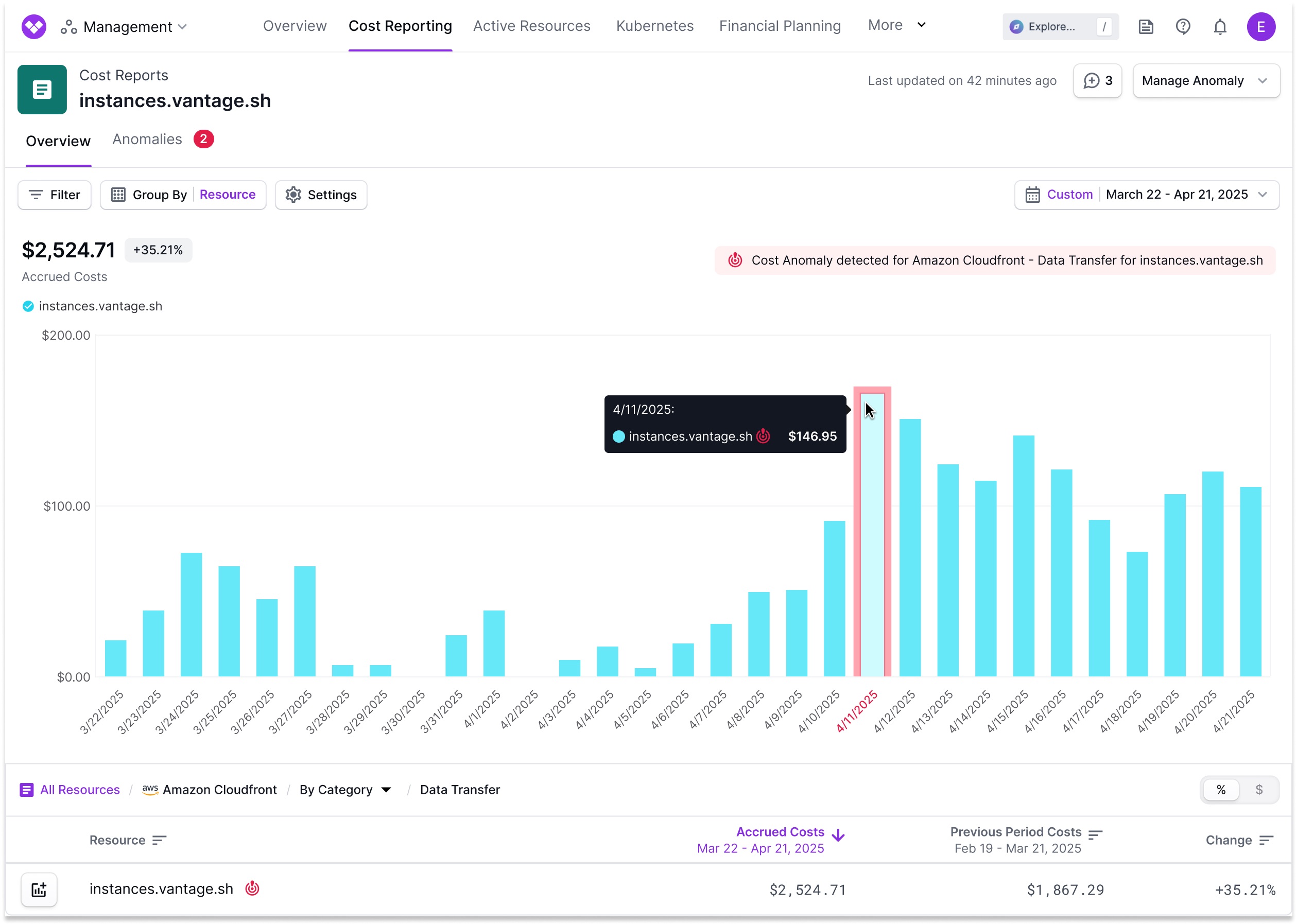 Today, Vantage is launching an enhancement for Anomaly Detection that automatically associates anomalies with the specific resource that drove them. Customers can now identify not only when a Cost Anomaly occurs, but also precisely which resource is responsible, streamlining the process of addressing unexpected cloud spend. This feature is available to all customers beginning today, with no additional configuration required.