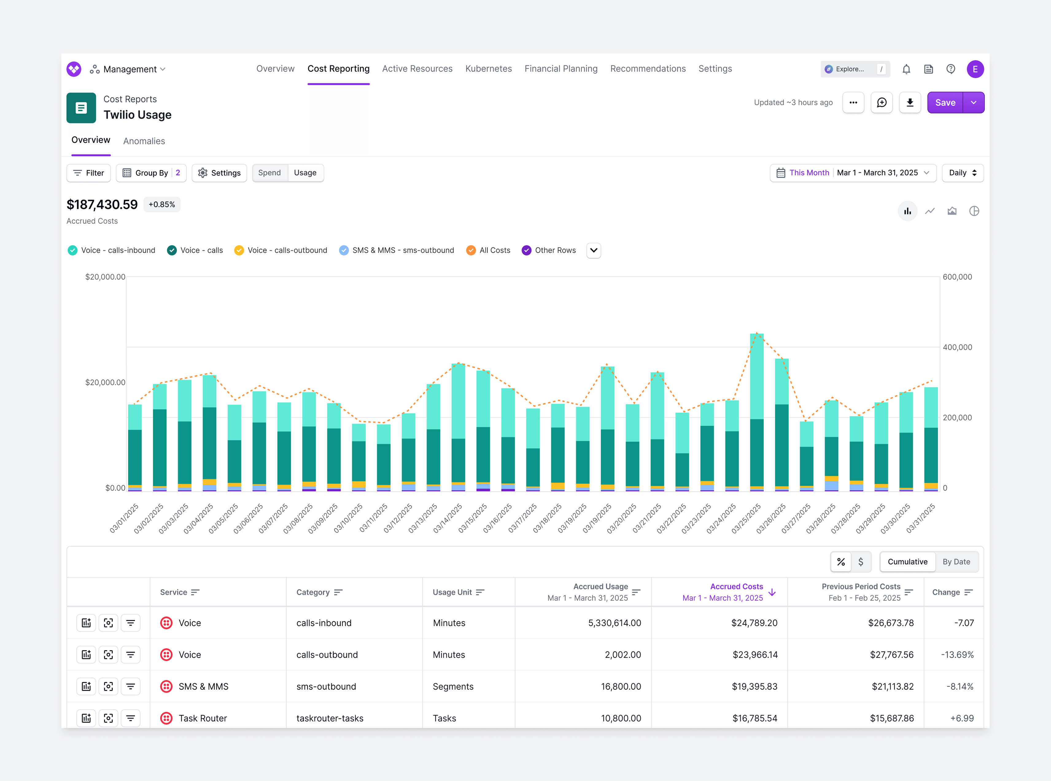 Twilio is a cloud communications platform that enables developers to integrate messaging, voice, video, and authentication services into applications using APIs. Customers use Twilio alongside cloud providers, such as AWS, Azure, and GCP, to enhance customer engagement through automated SMS notifications, AI-powered chatbots, two-factor authentication, and scalable call center solutions. For a complete view of application costs, teams need to see their Twilio and AWS/Azure/GCP expenses in a single Vantage report. This was previously possible through the Custom Provider integration in Vantage, but this integration required extra manual work to retrieve, format, and upload the data.