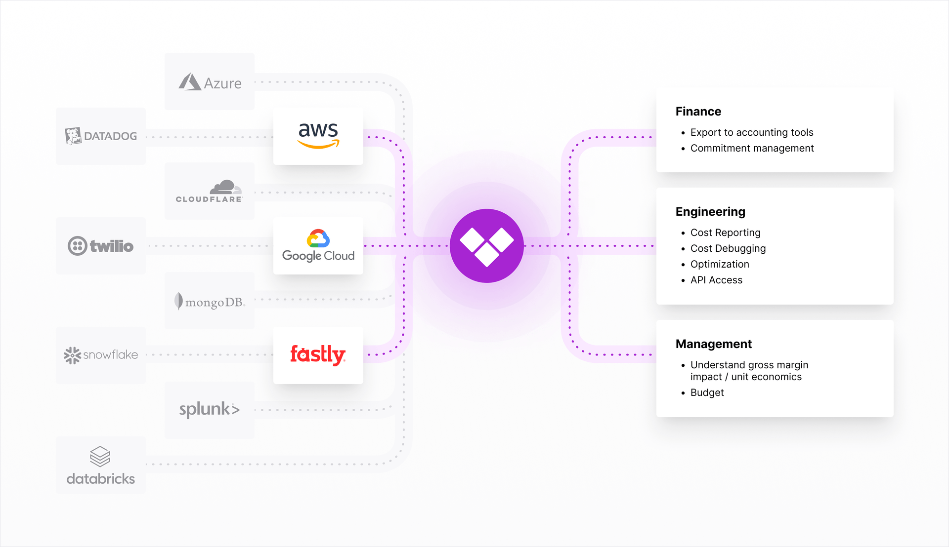 Customers are increasingly relying on multiple service providers in addition to their primary infrastructure provider. It’s common for a single customer to leverage five or more different usage-based infrastructure or service providers. As a company leverages more infrastructure and service providers, managing the costs associated with these providers becomes more difficult and requires devoted engineering time to integrate, normalize and analyze.