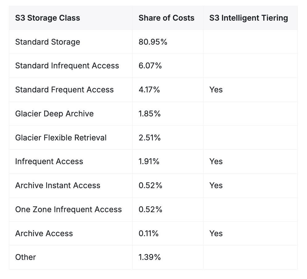 The vast majority of S3 storage costs were accrued on the standard storage tier - which is the default tier for S3. AWS offers services like S3 Intelligent Tiering, which automatically moves objects to cheaper storage tiers based on access patterns has been available since 2018.
