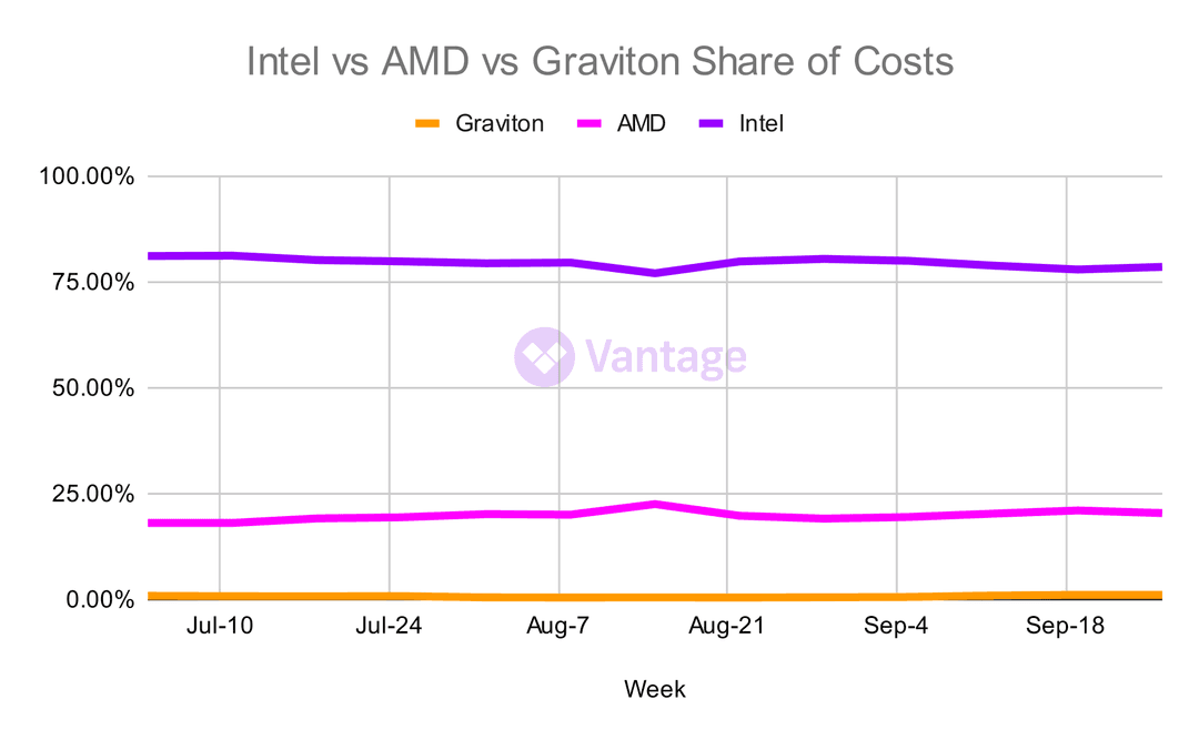 Intel remains dominant among traditional servers even with the much-hyped rollout of ARM Graviton processors on AWS. AMD holds onto 20% of the compute market share.