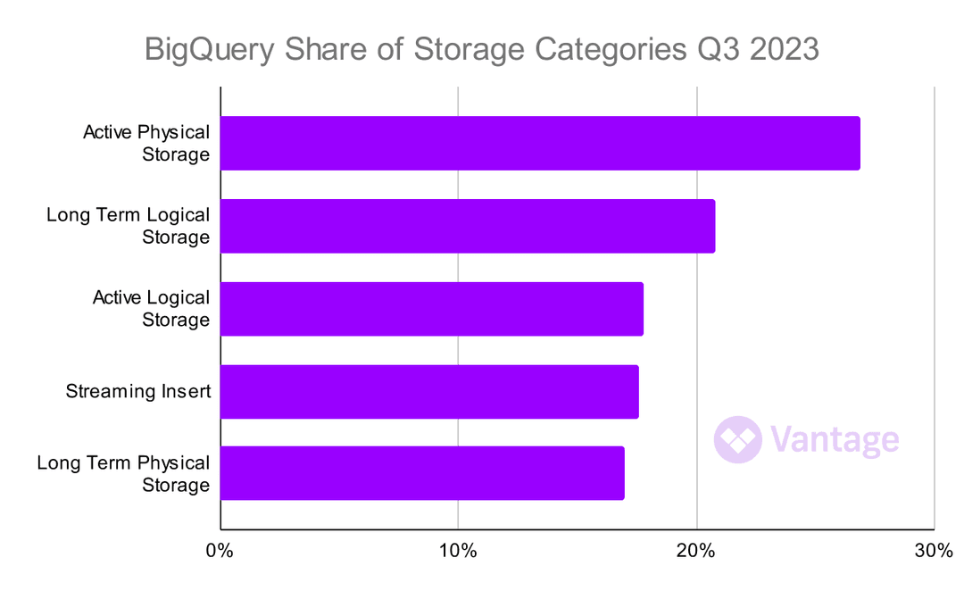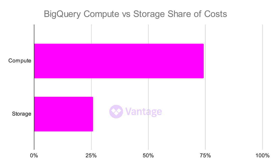 BigQuery compute accounts for the majority of costs, representing 74% of overall expenditures, while storage costs contribute the remaining 26%. On the compute side of the house, some of this difference may be influenced by new BigQuery editions pricing. Flat-rate pricing was replaced with new editions—like Standard, Enterprise, and Enterprise Plus—aimed at targeting a user's specific workload requirements.