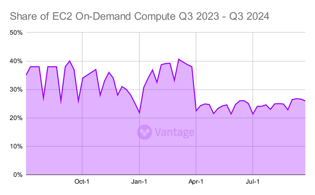 Last quarter saw a steep decline in On-Demand spend after increases in previous quarters. This quarter is a continuation of that, as EC2 users continue opting for Reserved Instances and Savings plans to commit and save.