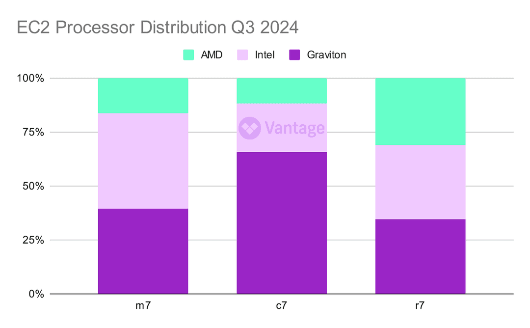 We've been analyzing the distribution of processor usage across EC2 and other AWS services. Findings reveal that services like RDS, ElastiCache, and OpenSearch predominantly use Graviton processors. This can be attributed to Graviton's cost and performance benefits.