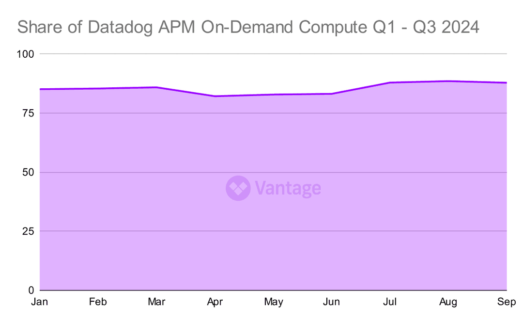 Datadog users, on the other hand, are not taking advantage of commitments. Throughout the year, On-Demand spend for APM has remained between 82-87% without much fluctuation.