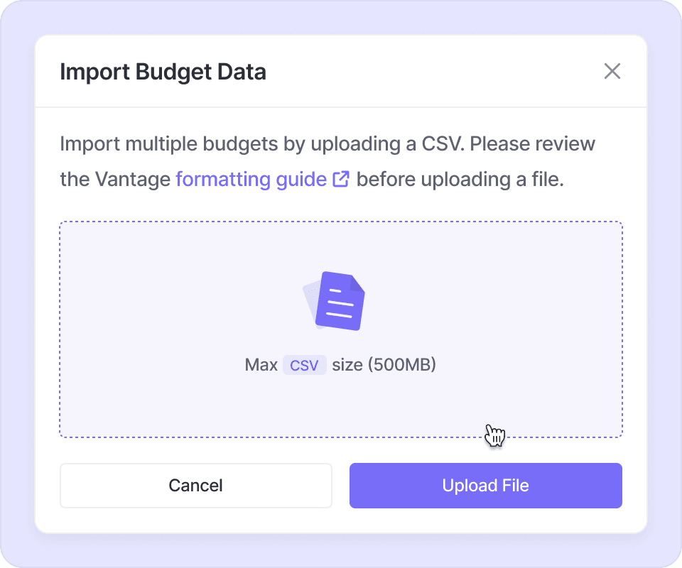 Bulk‑upload budget data held in spreadsheets or ERP tools to regularly sync Vantage with your finance-friendly source of truth.