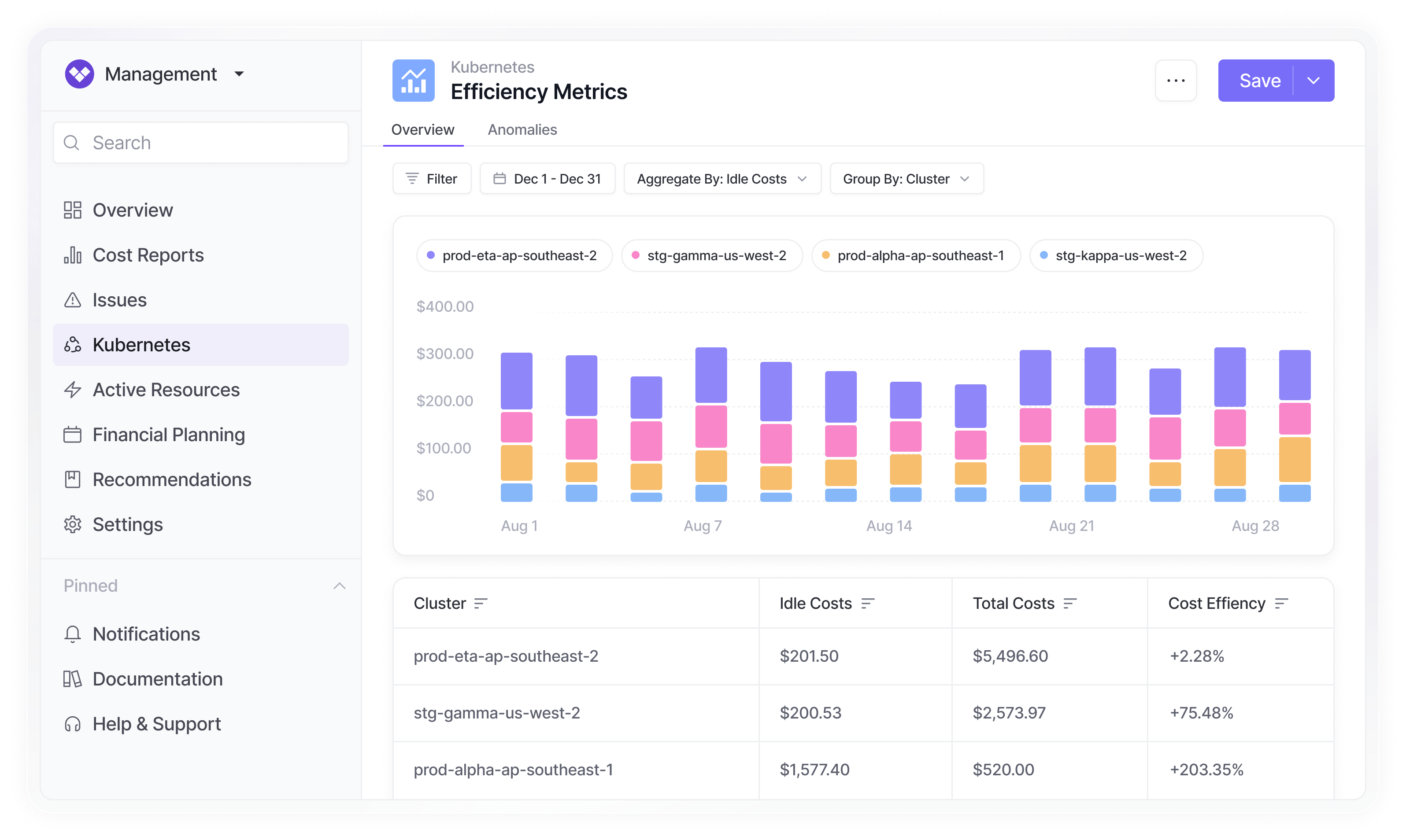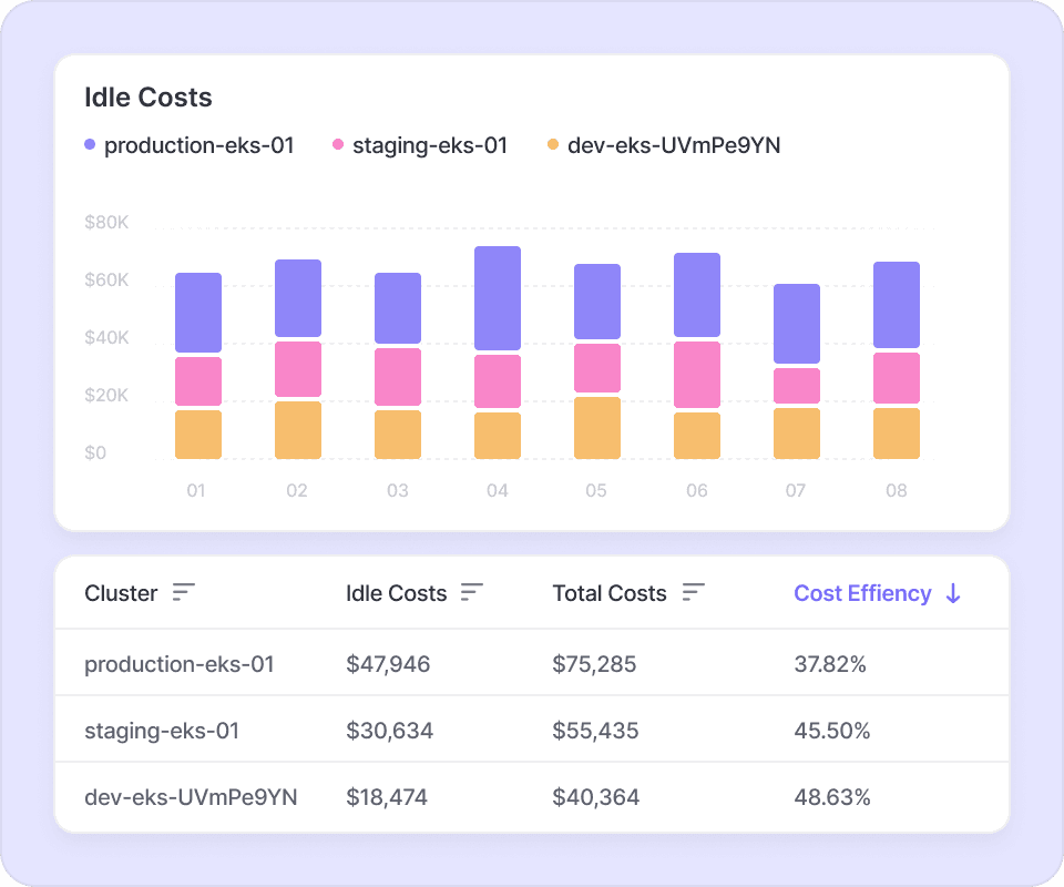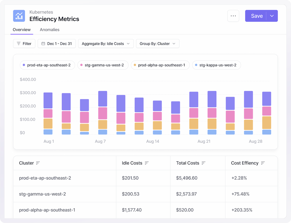 Monitor compute costs allocated by namespace, deployment, or label. Identify pod waste and rightsize workloads.
