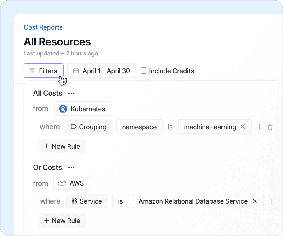 Give teams the ability to see their Kubernetes costs alongside shared out-of-cluster costs from AWS, GCP or Azure in a single cost report.
