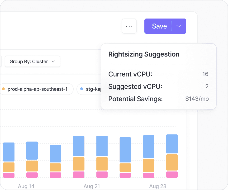 Get real time pod rightsizing recommendations to correct over-allocated vCPU and memory on a per-container basis.