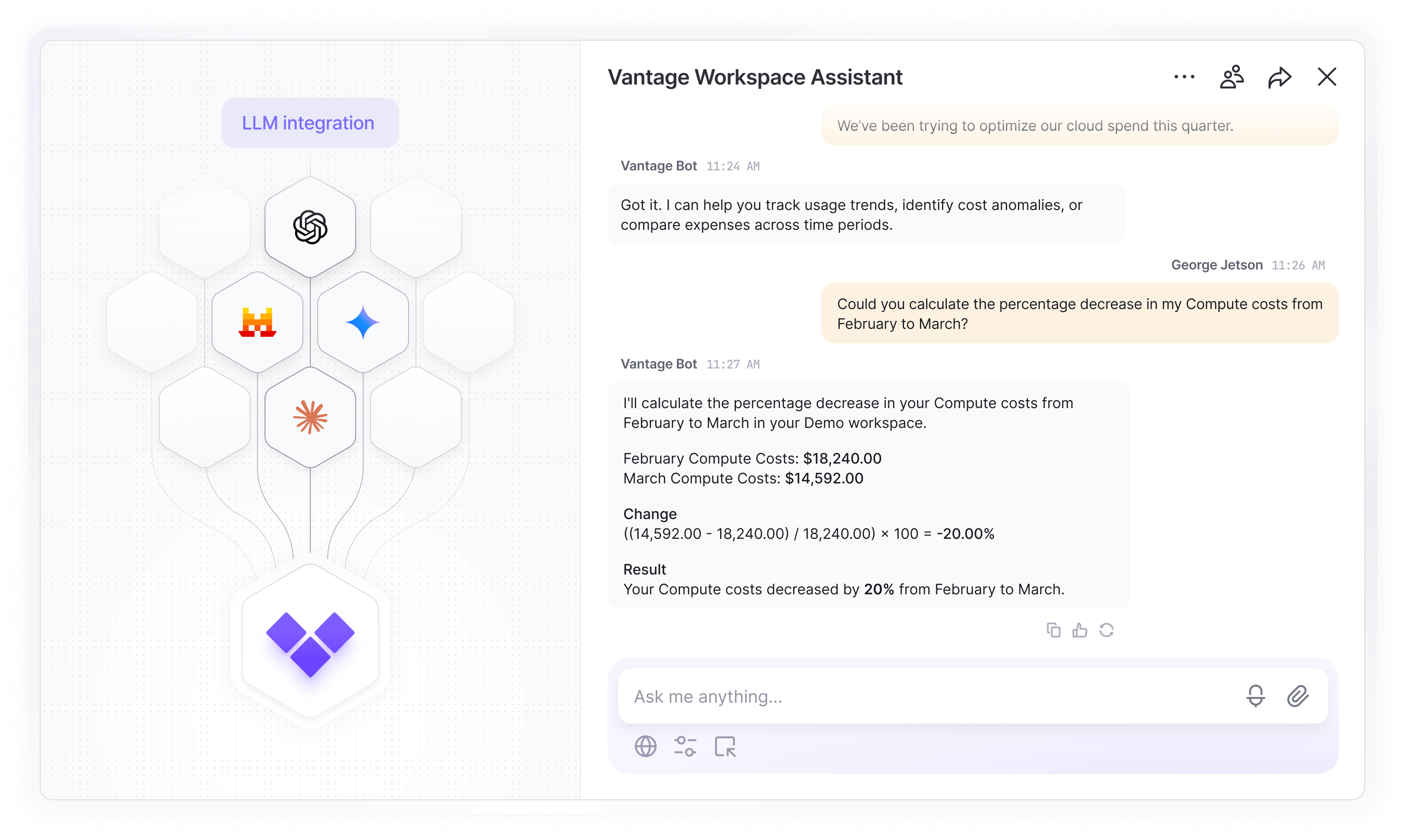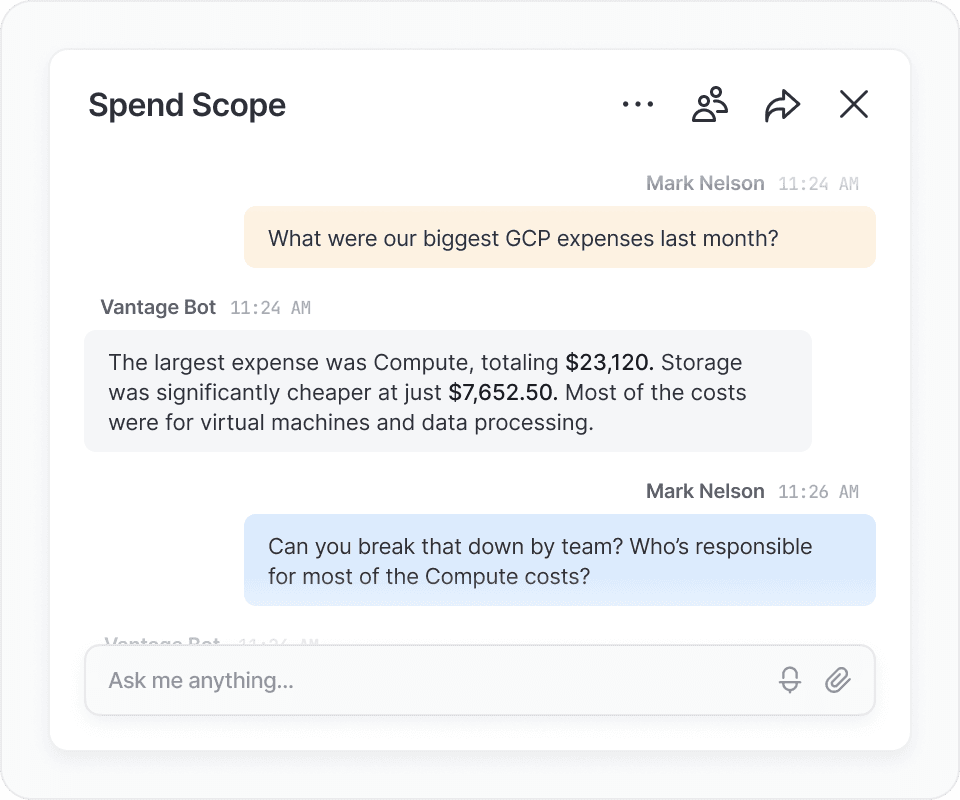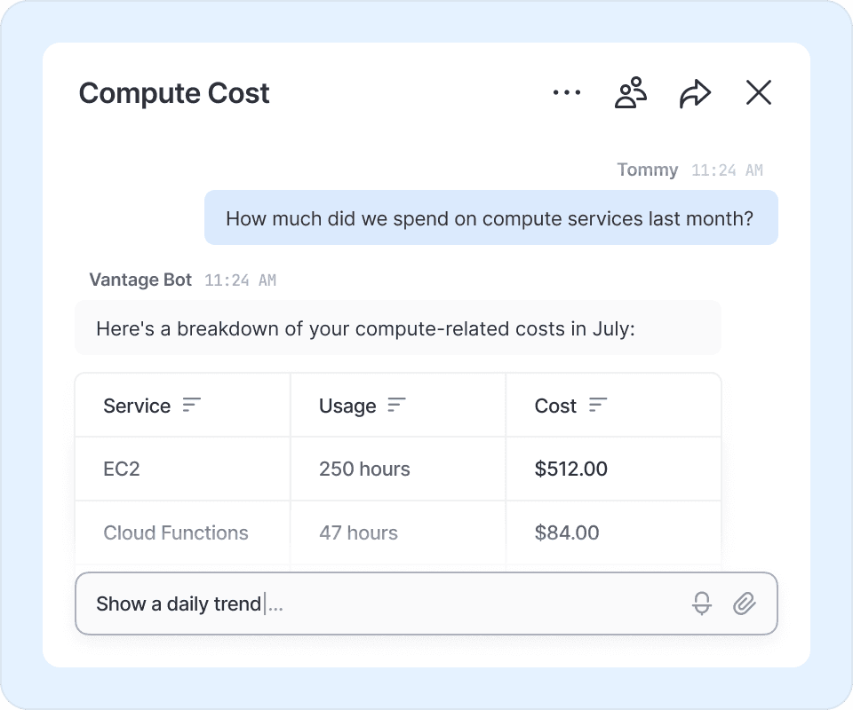 Enable anyone in your organization to understand cloud costs. Invite engineering, finance and management constituents to easily interact with your structured cost data via a conversational interface.