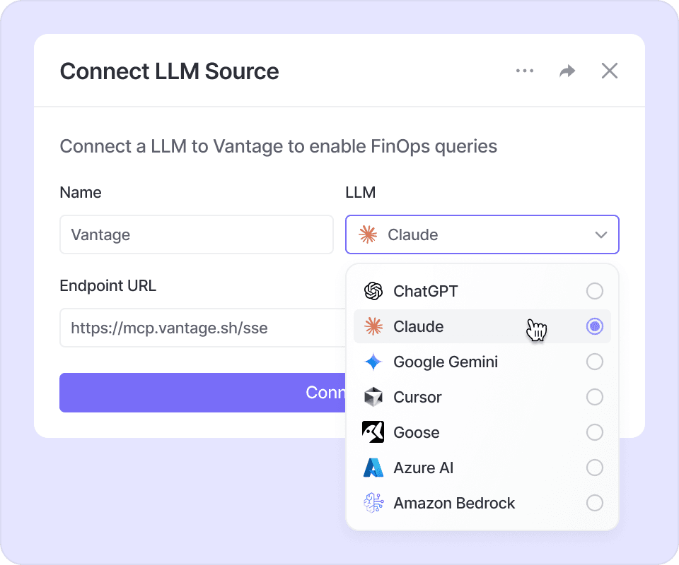 Vantage has a hosted Model Context Protocol (MCP) server to allow you to easily integrate with popular LLMs like ChatGPT by OpenAI and Claude by Anthropics.