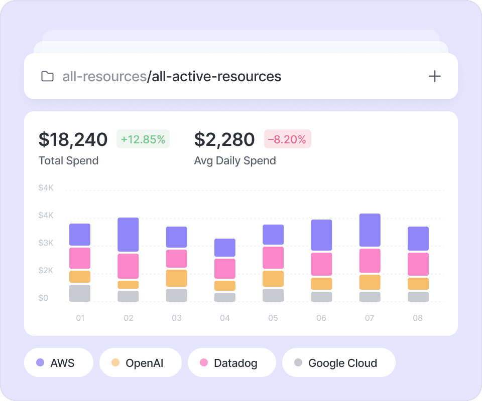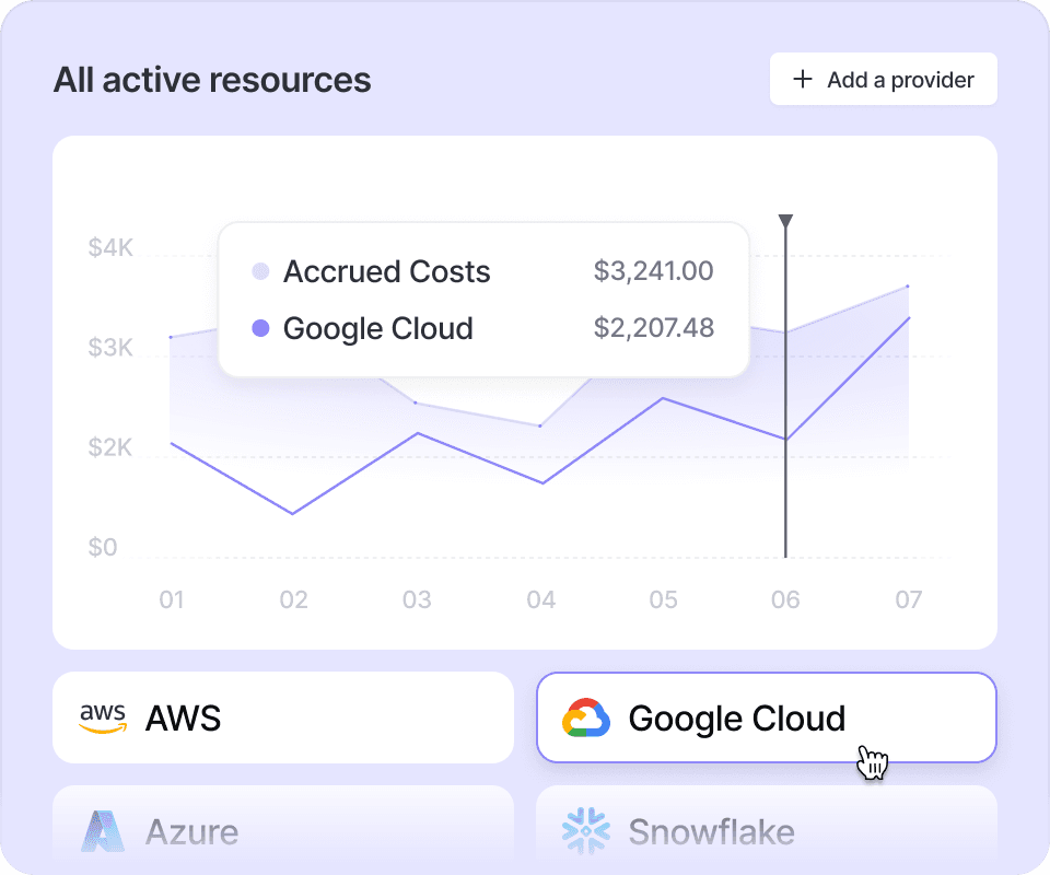 Even if you use 20 different providers, Vantage integrates into each of them. See a full inventory of resources driving costs in one place across all supported vendors.