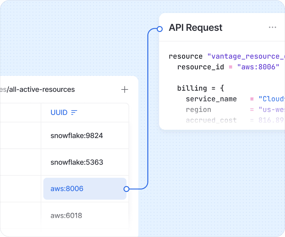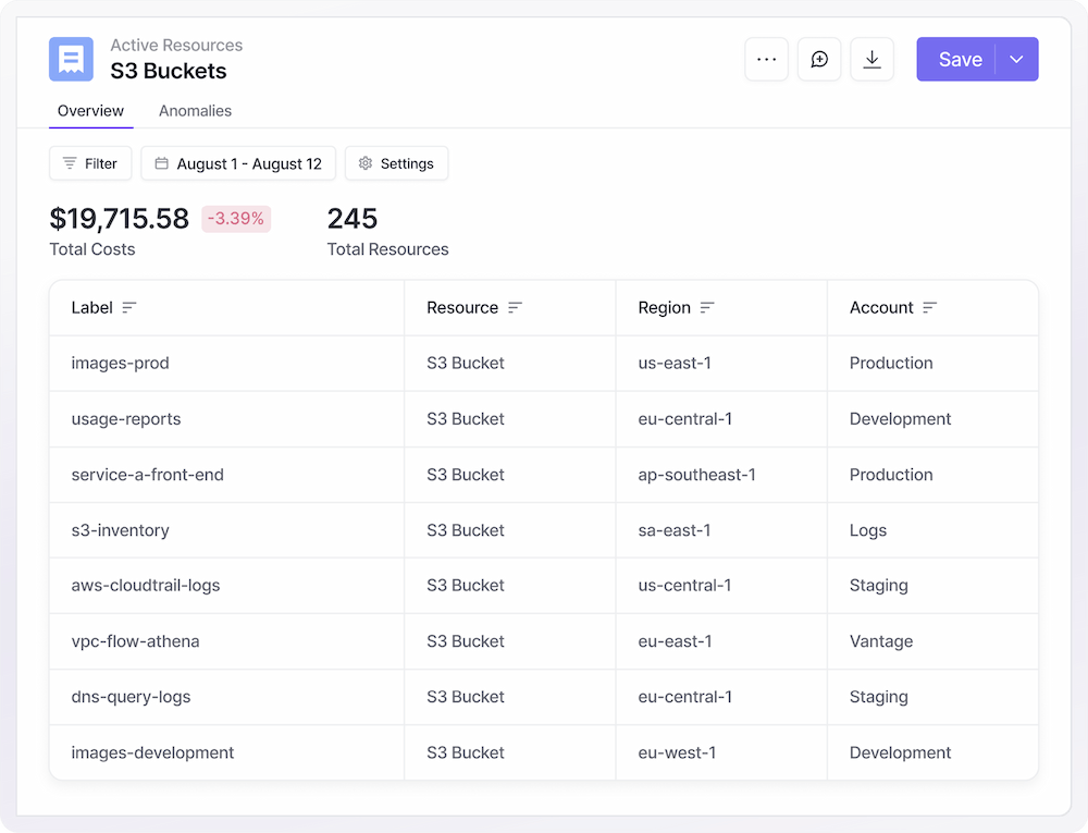 Vantage integrates with service APIs to show you a snapshot of all active resources driving costs. Get a full inventory of every offending resource.