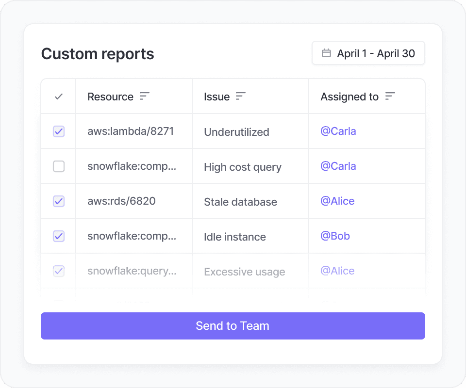 Give your team a list of resources to take action on. Easily send teams lists to action on like abandoned resources, antiquated virtual machines or un-optimized storage volumes.