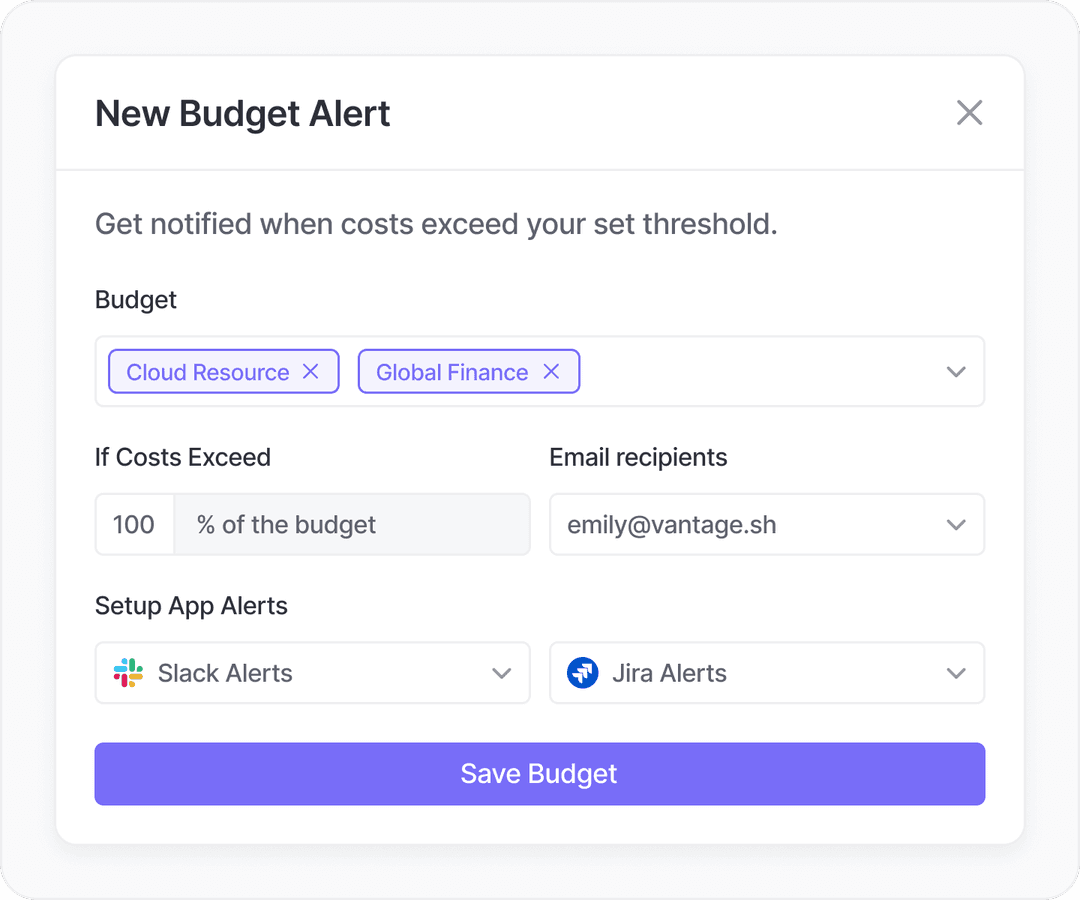 Get automatic alerts for unusual spikes or budget overruns in Databricks usage or cost. Vantage continuously monitors your environment and notifies you when spend deviates from normal patterns, so you can take action early.