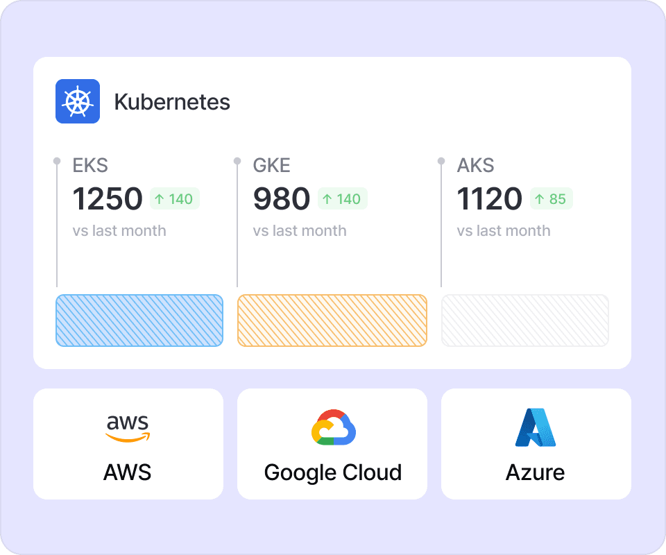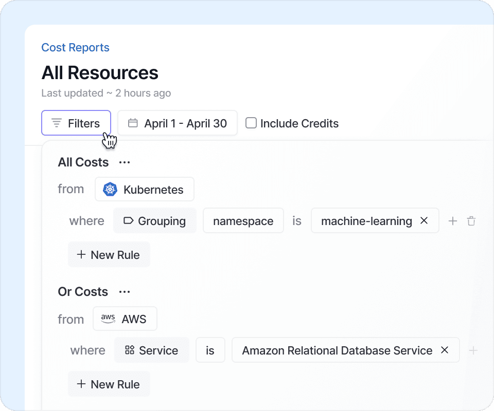 Combine costs by Service, Namespace, and Label with external resources, such as databases, caching, and storage.