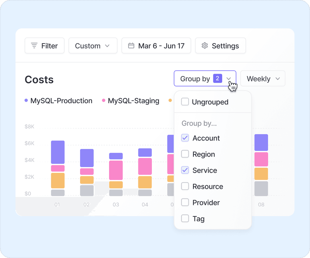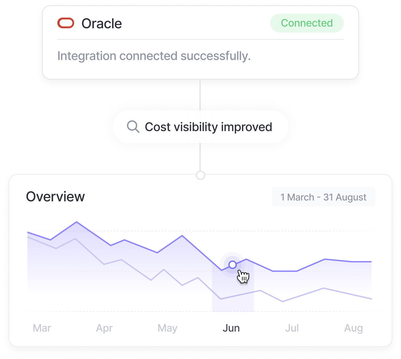 Break down spend across database, tenancy, and more. Filter by team, region, or project to understand where your Oracle Cloud costs are coming from, and how to optimize them.